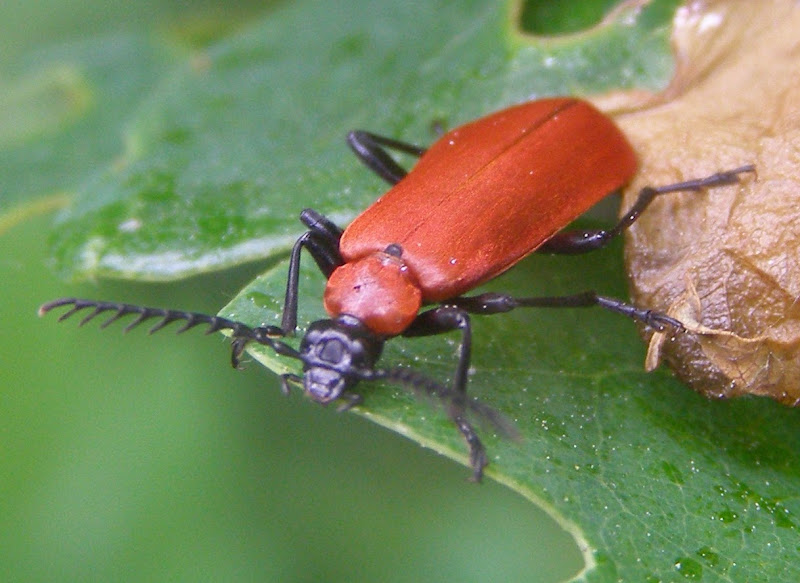 Sun 2010-06-06 A cardinal beetle, Pyrochroa coccinea (Coleoptera: Pyrochroidae), on an oak leaf.
